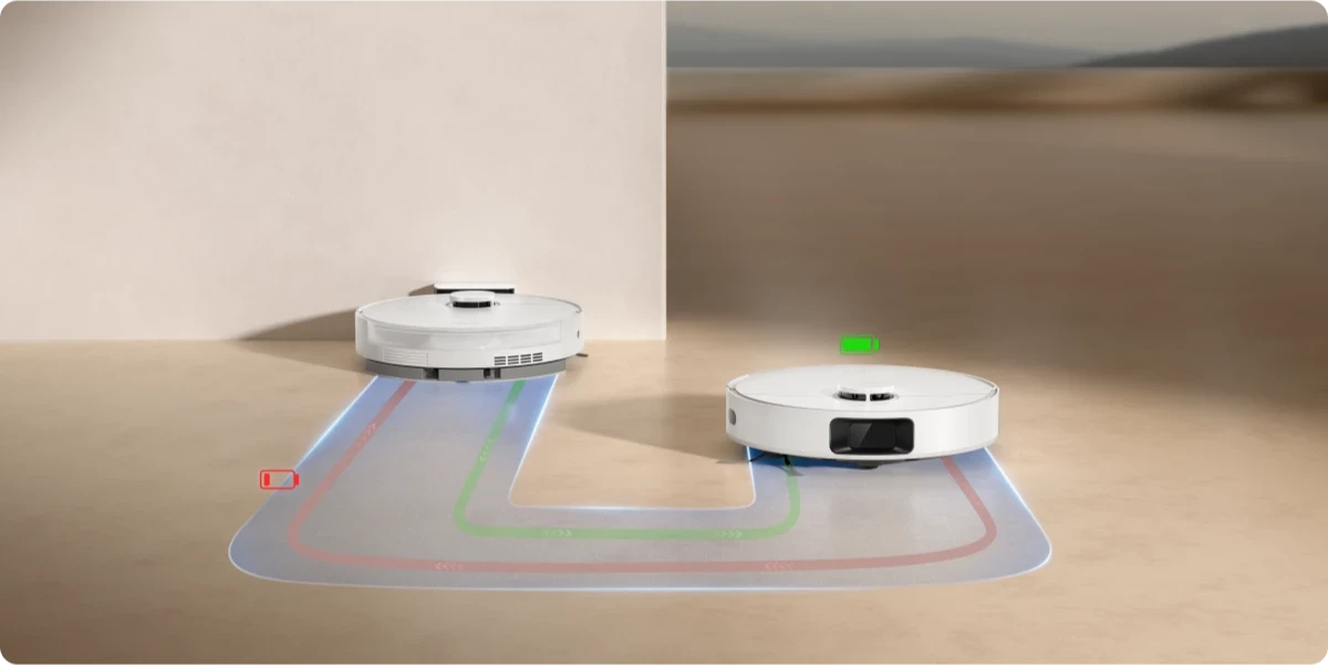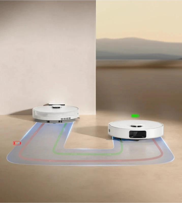 Längere Reinigungsdauer dank unserem großen Akku mit längerer Laufzeit. Bei geringer Akkuladung fährt der Saugroboter zum Aufladen automatisch zur Station und setzt die Reinigung danach fort.