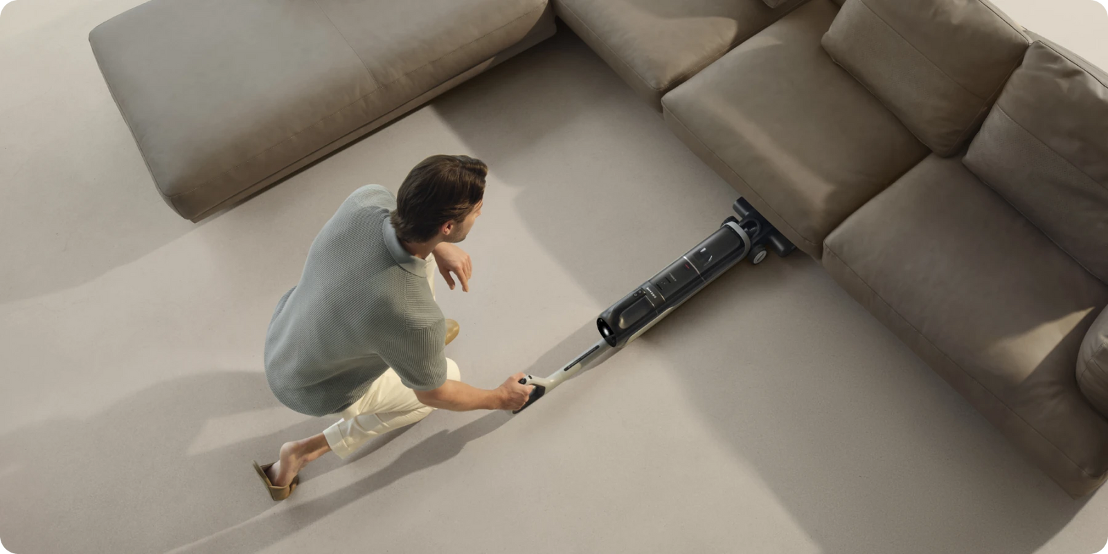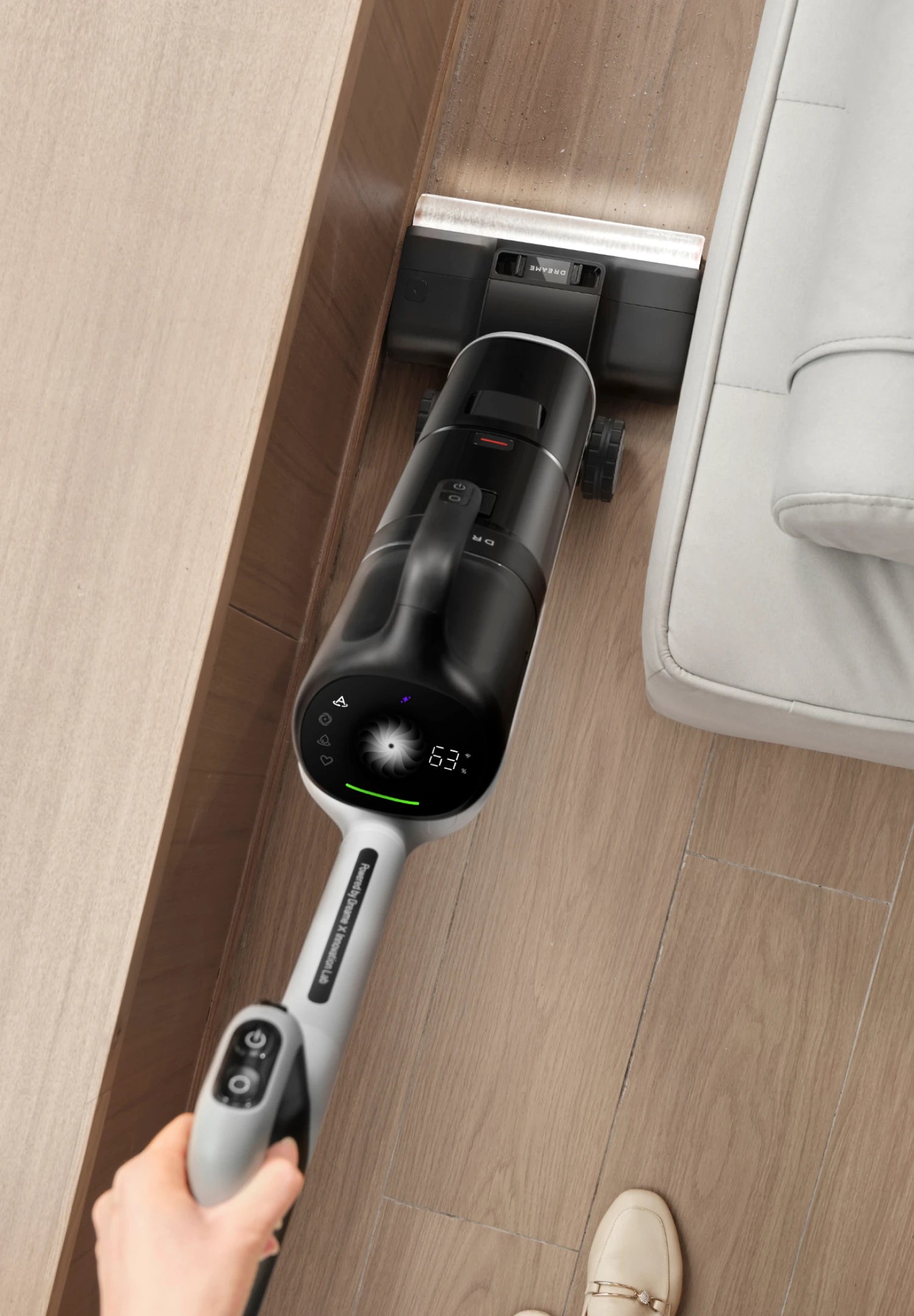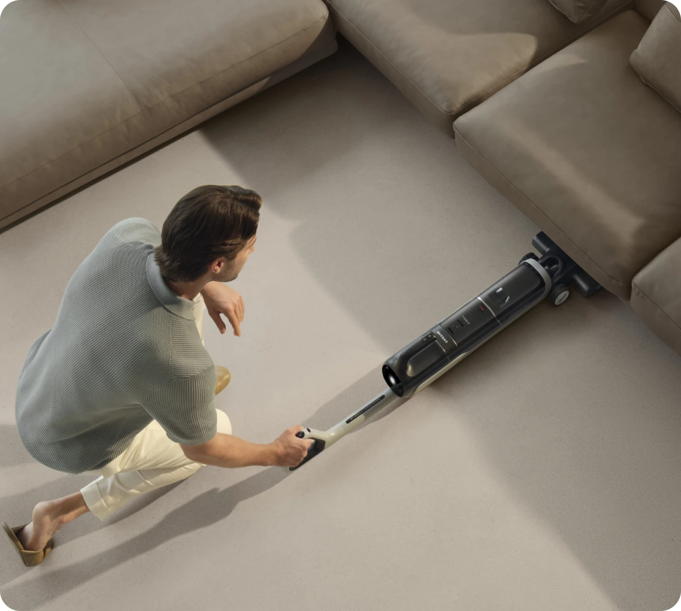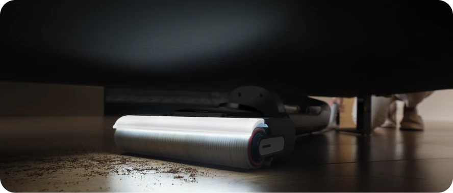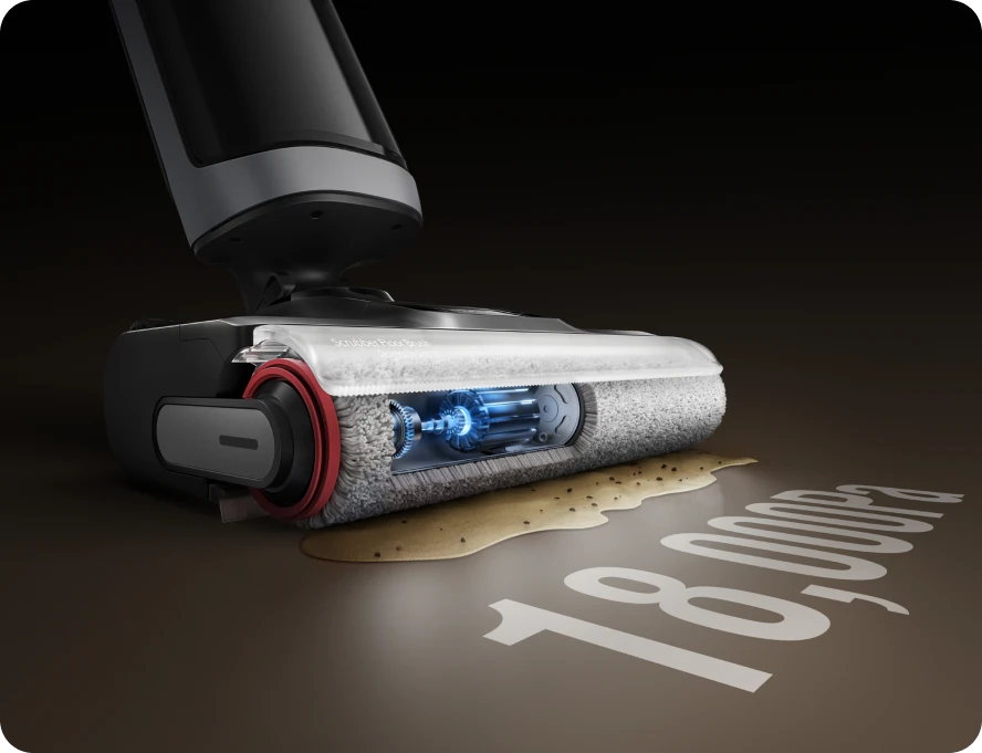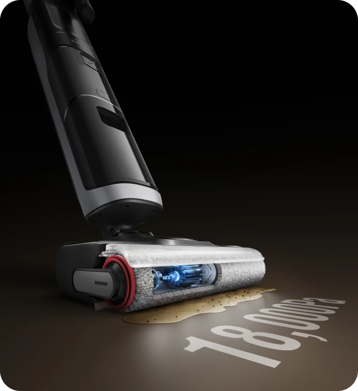 180 °-Reichweite mit flachem Design. Tiefenreinigung unter Möbeln und an schwer erreichbaren Stellen mit uneingeschränkter Saugkraft von 18.000 Pa.
