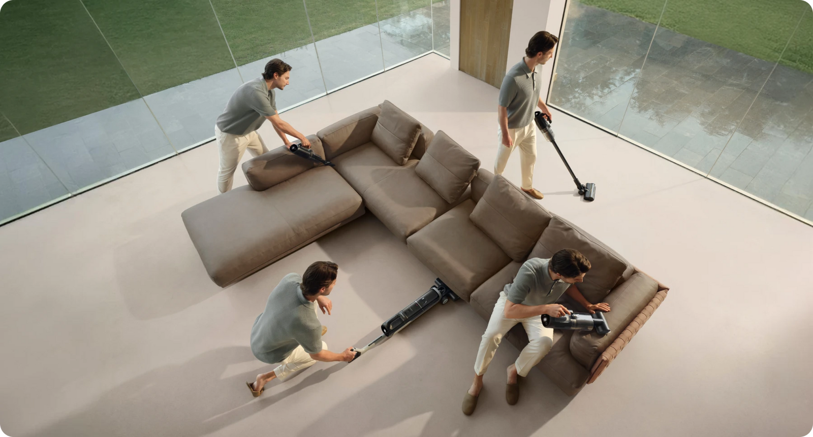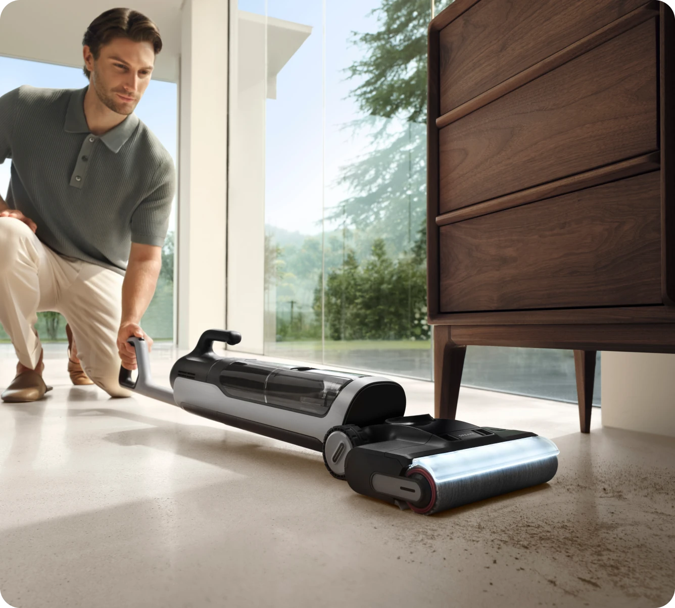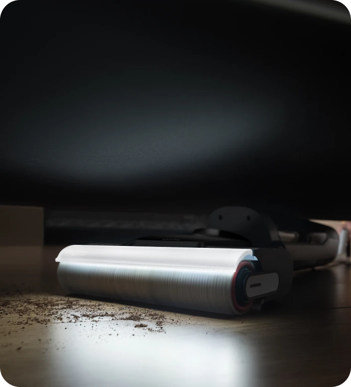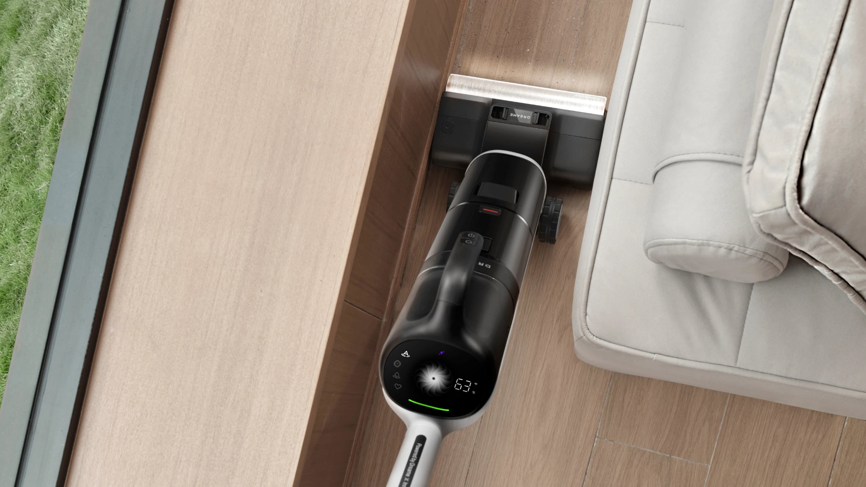 180 °-Reichweite mit flachem Design. Tiefenreinigung unter Möbeln und an schwer erreichbaren Stellen mit uneingeschränkter Saugkraft von 18.000 Pa.