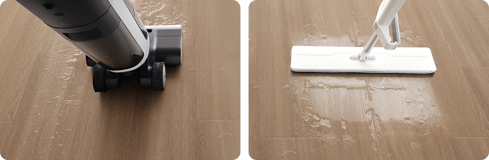 Der H14 Dual sorgt für eine gründliche Reinigung, bei der praktisch keine Wasserflecken hinterlassen werden, um Ihre Böden zu schützen. Beim herkömmlichen Wischen kann es hingegen zu Schimmel- und Geruchsbildung, Aufweichen oder Verziehen von Holzböden kommen.