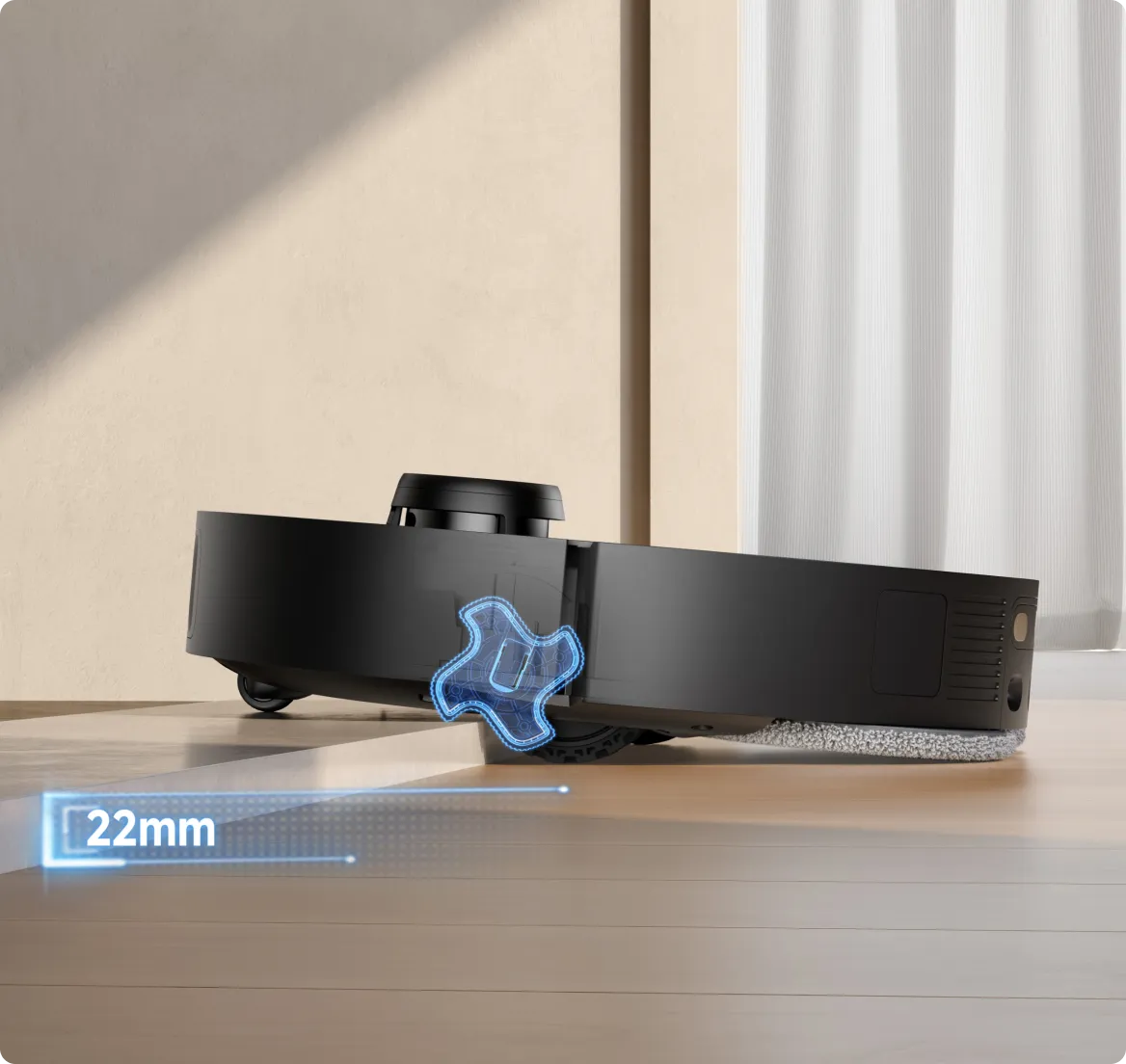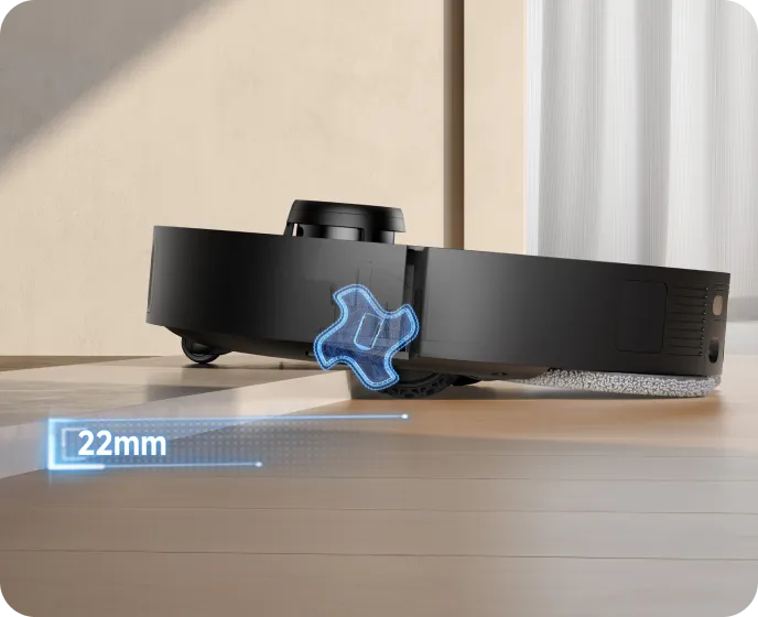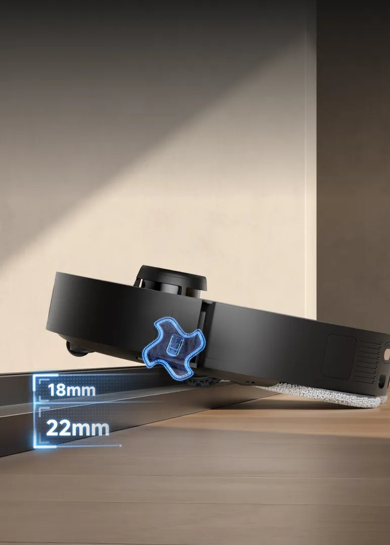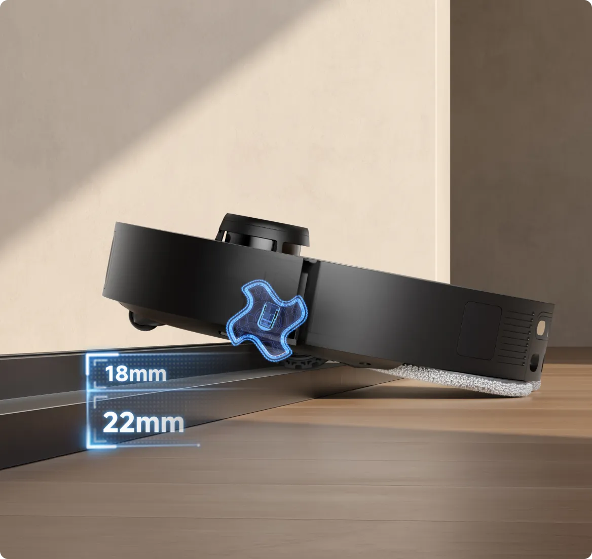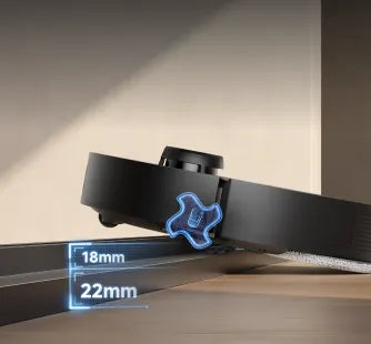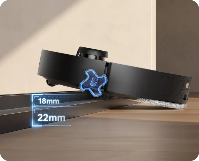 Unser EasyLeap™-System umfasst 4 Räder, mit denen der Saugroboter Stufen und Türschwellen mit einer Höhe von bis zu 40 mm* überwinden kann. Diese Technologie funktioniert auch effektiv auf feuchten Böden, rutschigen Küchenoberflächen oder Schienen von Schiebetüren.