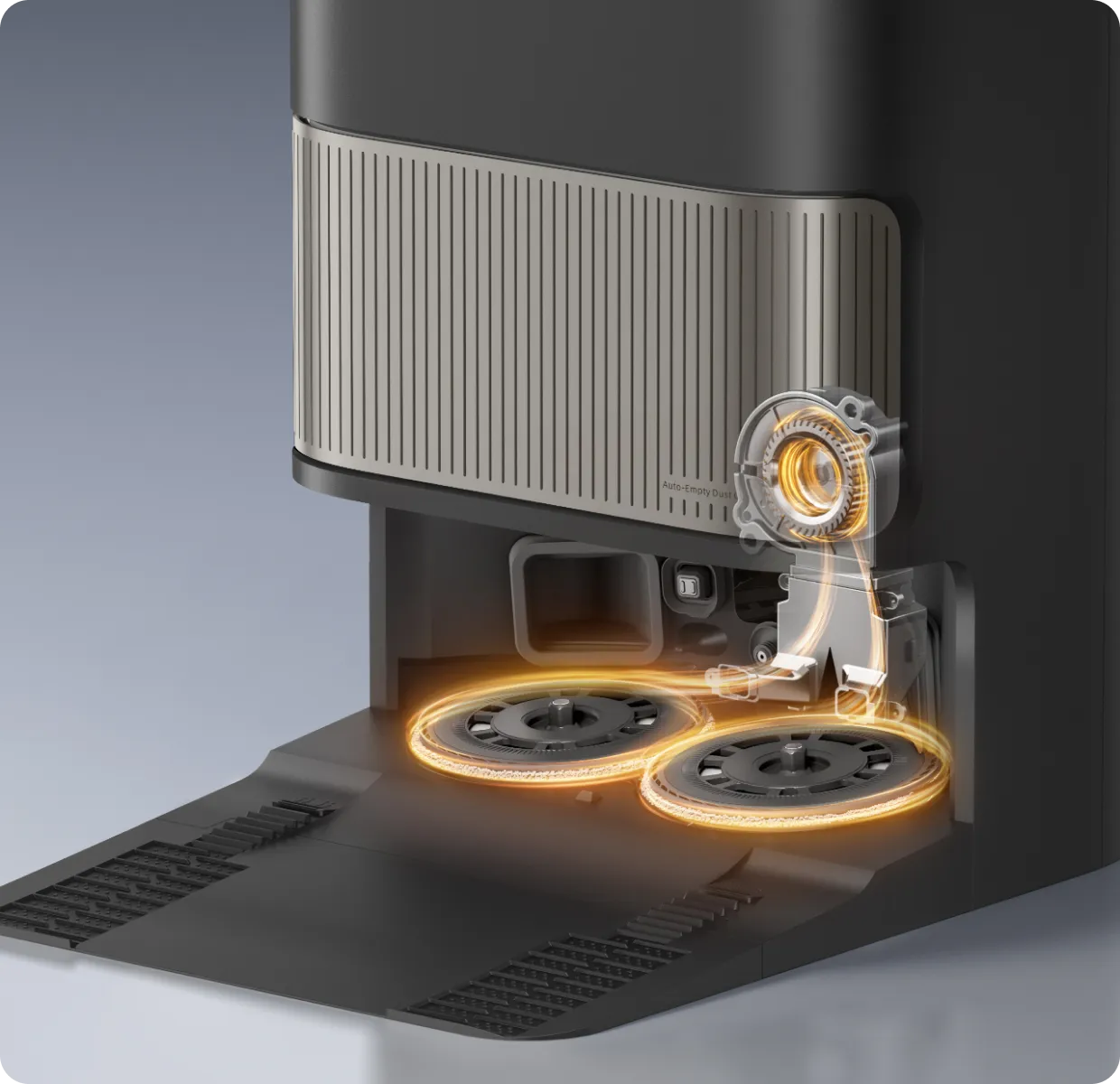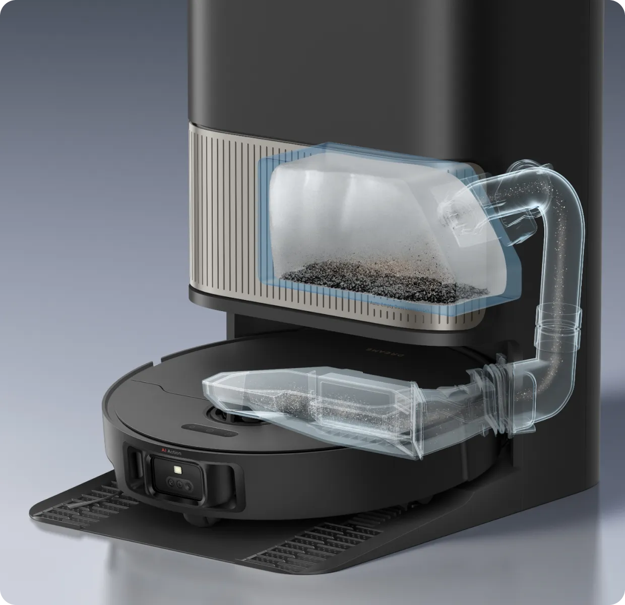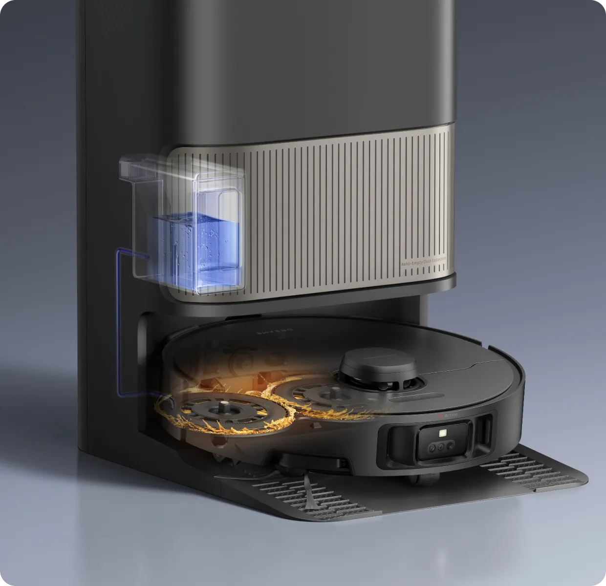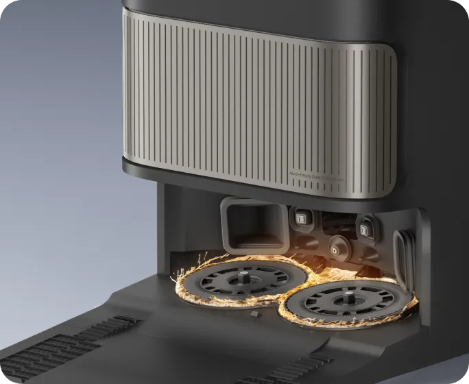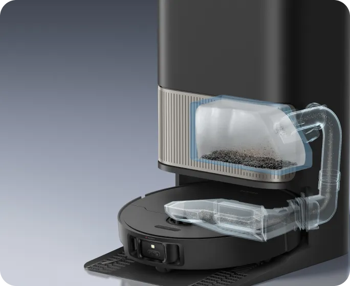 Die Funktion „Erste Tiefenreinigung“ wird beim ersten Anschalten vom System empfohlen. Dabei kommt nach dem Staubsauger-Modus automatisch der Wischmopp-Modus, sowie eine häufigere automatische Entleerung, damit Staub und Schmutz gründlich beseitigt werden und die Reinigung von Anfang an optimale Ergebnisse liefert.