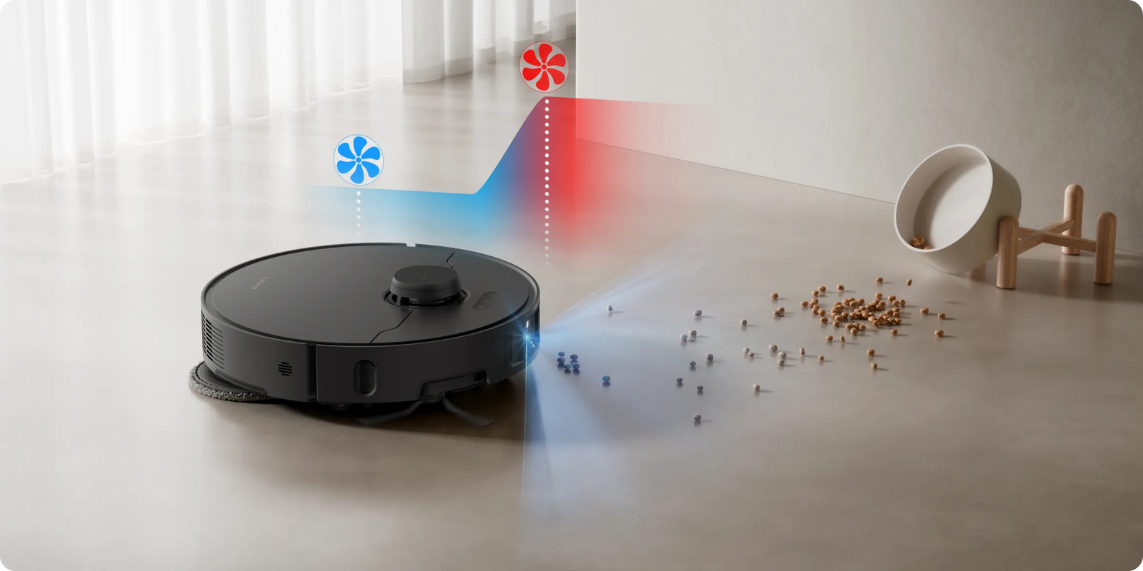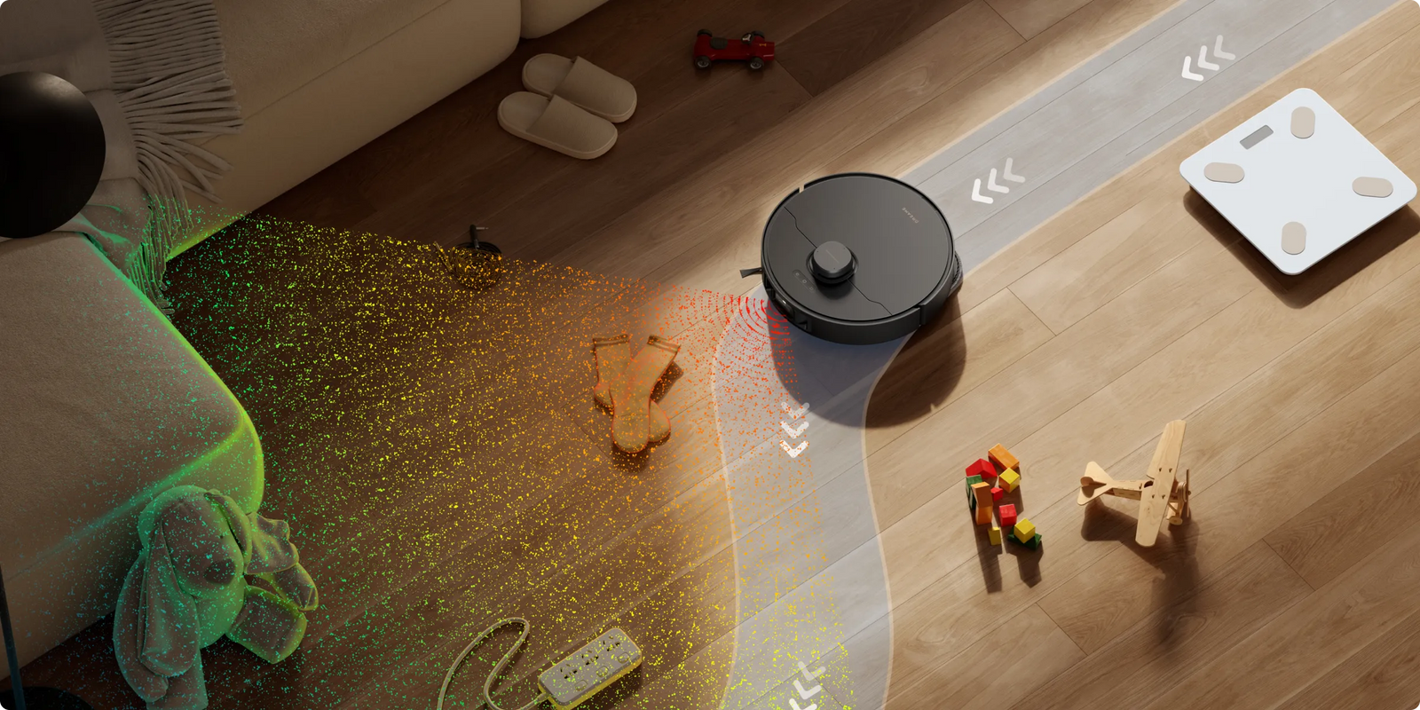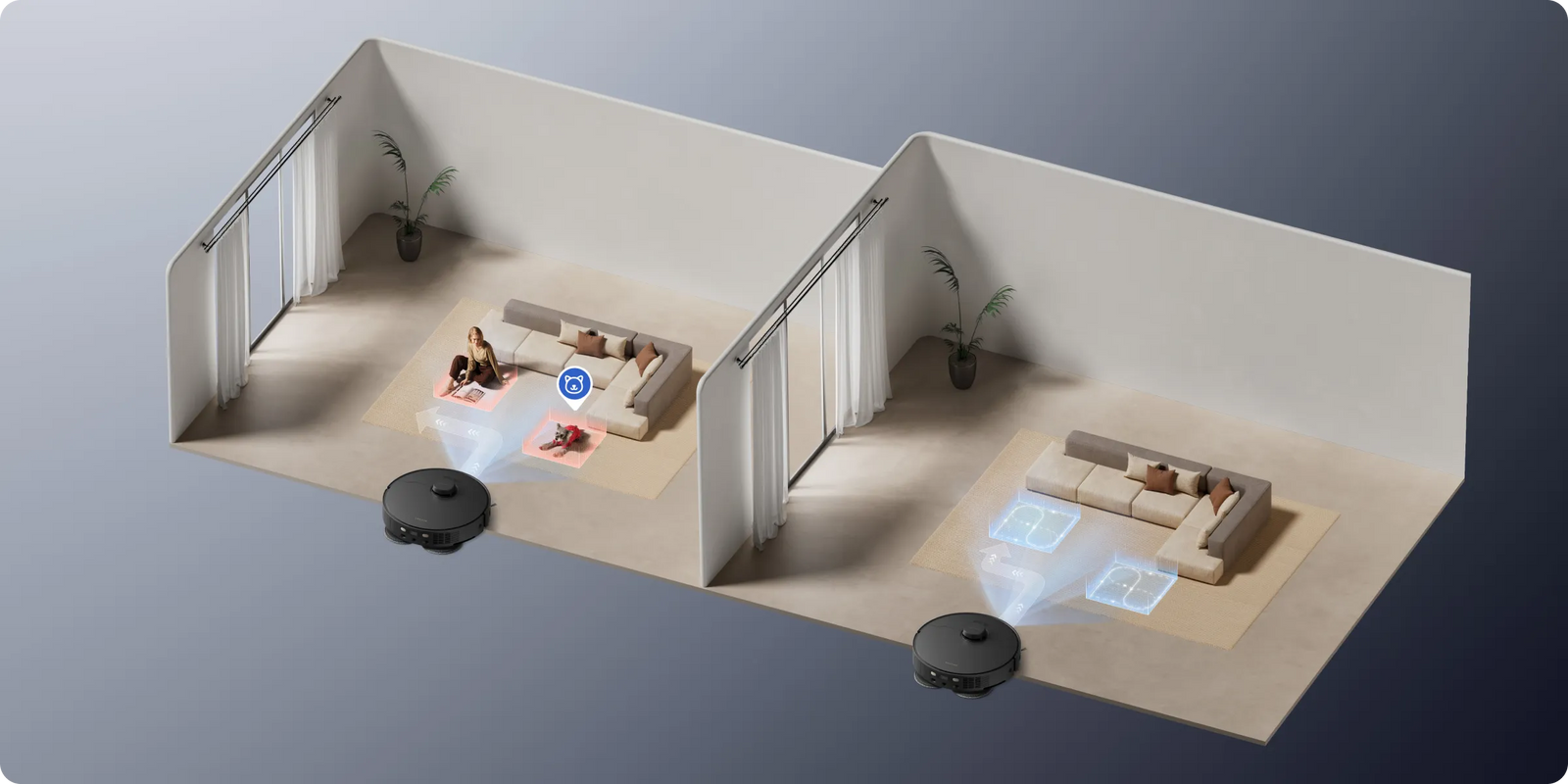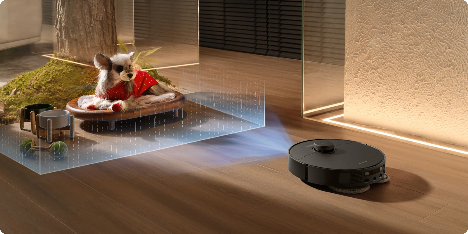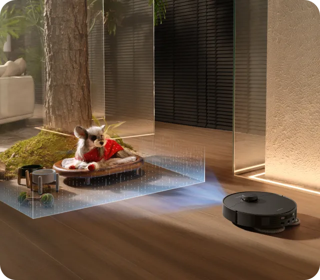 Der L40s Pro Ultra gleitet sicher durch Ihr Zuhause ist sogar haustierfreundlich. Er erkennt Hindernisse (Futterschalen/Katzentoiletten), Menschen und Haustiere und weicht ihnen aus. Die ausgesparten Bereiche werden später im Nachgang gereinigt.