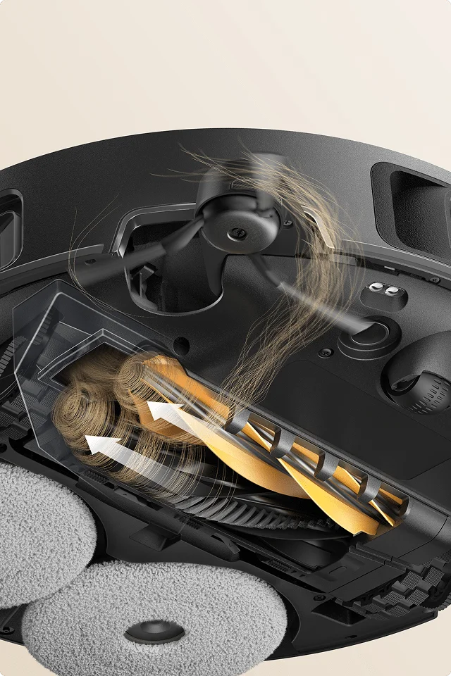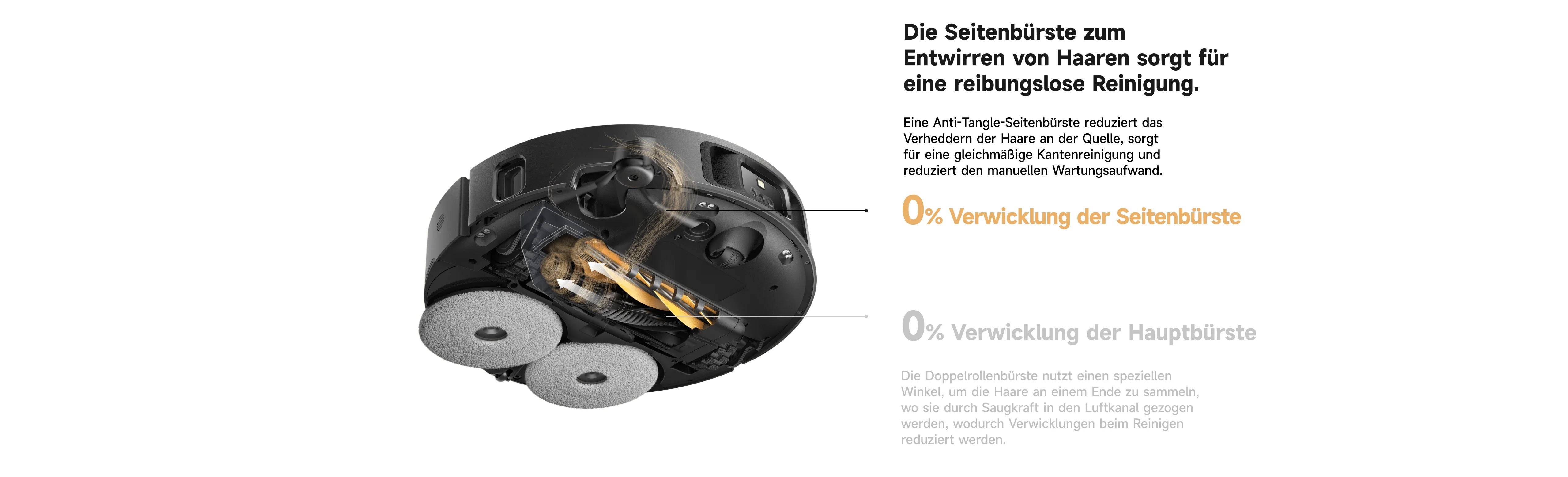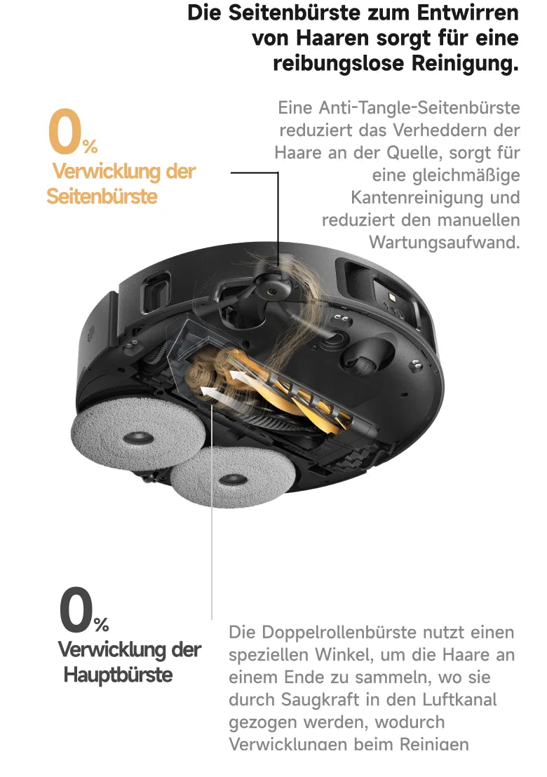 Die Doppelbürsten beseitigen Haare von Böden und Teppichen und sorgen zugleich für eine gleichmäßige Saugleistung, wodurch Verwicklungen reduziert werden und eine leisere, effiziente Reinigung der Oberfläche erzielt wird.