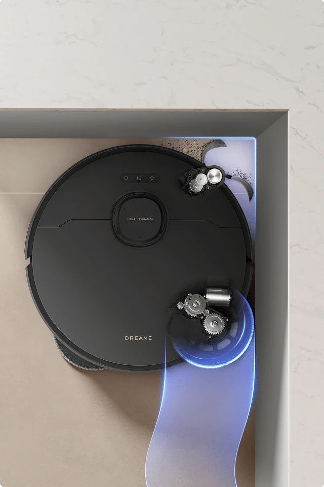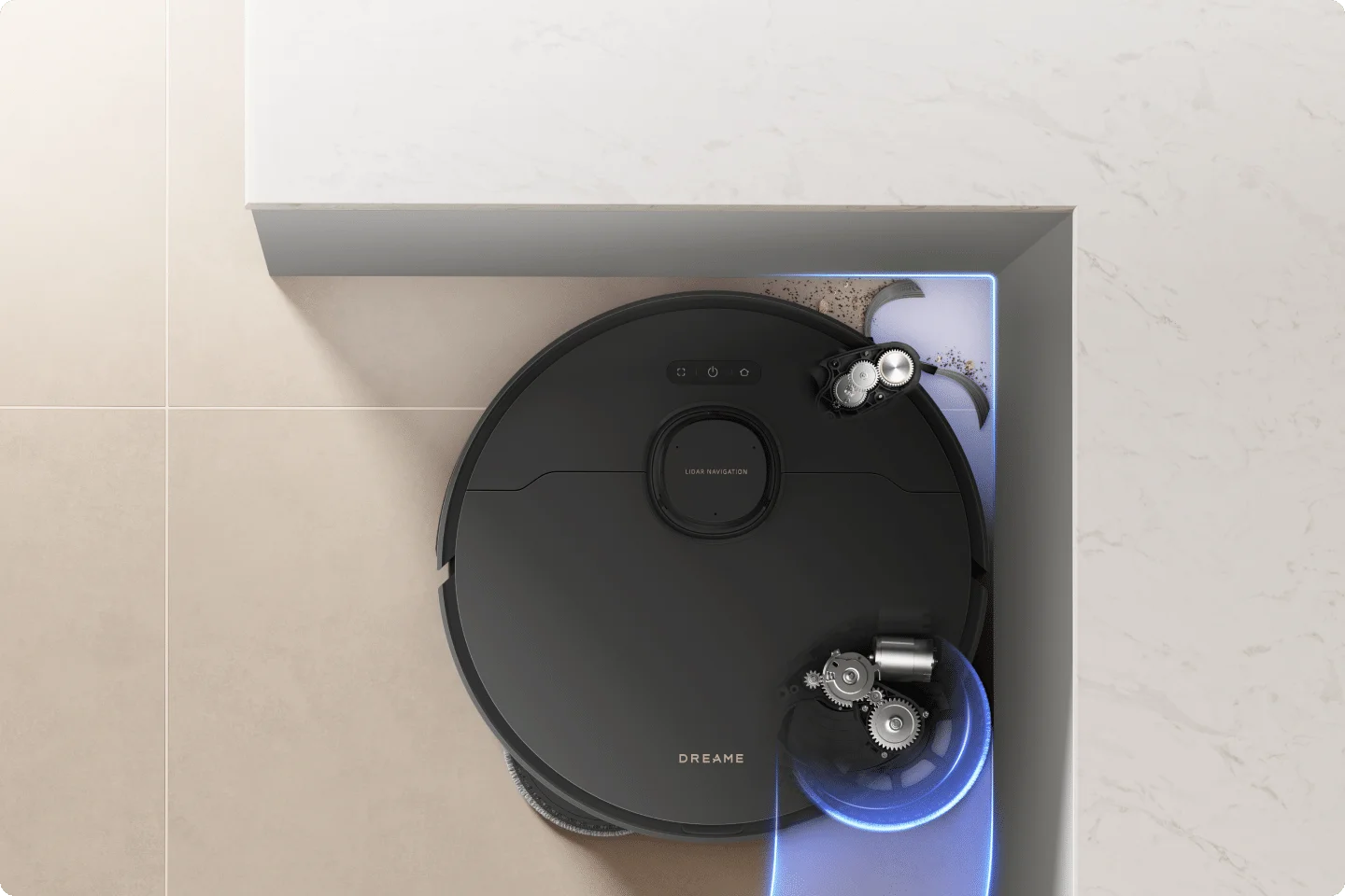 Die Seitenbürste fährt automatisch aus, um Ecken und Kanten zu erreichen und Schmutz aus engen Zwischenräumen zu entfernen, um eine umfassende Abdeckung zu gewährleisten.
