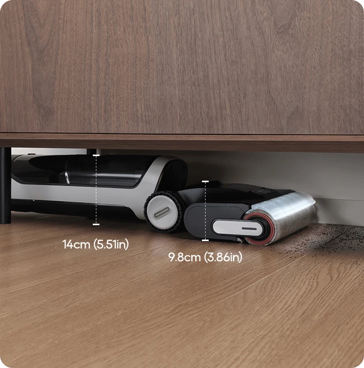 ¹180°, 14 cm, 9,8 cm: Der gesamte Sauger passt in niedrige Zwischenräume bis 14 cm Höhe und der Bürstenkopf sogar bis 9,8 cm Höhe, basierend auf Tests im Dreame Lab.