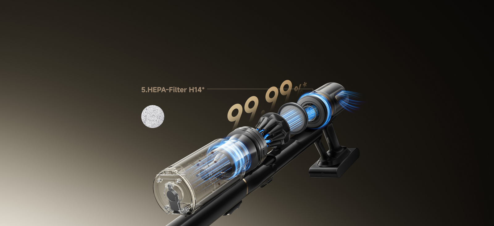 Die fortschrittliche Zyklontechnologie generiert eine starke Zentrifugalkraft, um Staub effizient abzuscheiden und ein Verstopfen des Filters zu verhindern – dies garantiert eine gleichmäßige, verlustfreie Saugleistung von Anfang bis Ende.